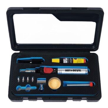 Features: Auto ignition Adjustable flame Easy start ignition Inbuilt fold out stand Solid metal construction Soldering temperature 400ºC Torch temperature 1300ºC Blow Tip temperature 500ºC Compatible with Purified 11x Butane gas (HDGAS5) Model number HD1976K Ideal for: Electrical soldering Heat shrink Wood burning Foam cutting Engraving Kit includes: 4 x Tips Heat shrink scoop Spanner Resin core solder Safety cap Bonus 18ml butane gas refil Sturdy carry case