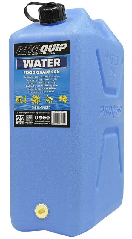 The Pro Quip 22L Light Blue Plastic Water Jerry Can with Tap is 100% Australian Made from Food Grade HDPE is UV stabilised and BPA Free.