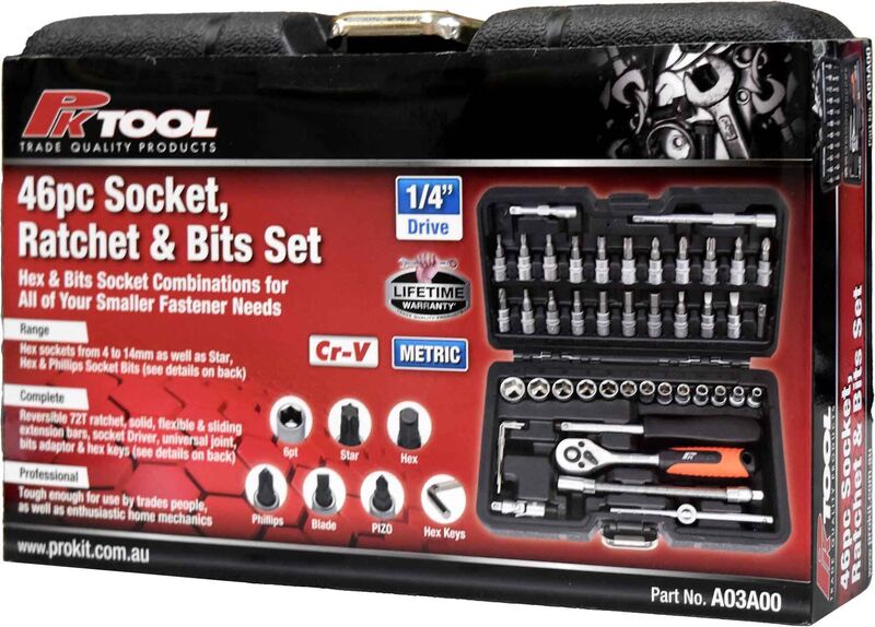 Hex & bits socket combinations for all of your smaller fastener needs A broad range of 1/4” hex sockets combined with Star, Hex, Phillips, Pizo & Blade Socket Bits are ideal for most vehicle requirements Reversible 72T ratchet, solid, flexible & sliding extension bars, socket Driver, universal joint, bits adaptor & hex keys Tough enough for use by trades people, as well as enthusiastic home mechanics Handy storage case makes it ideal for the workshop or car