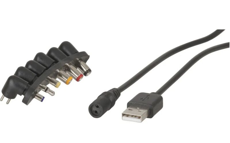 This handy DC to USB lead pack allows you to power up devices using 5V from a USB port. Includes 6 different size tips which include 1.35, 1.5, 1.7, 2.1, 2.5mm DC and 3.5mm Audio jack.