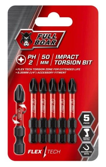 Features: Flex Tech torsion zone – Absorbs high torque stress and reduces bit fracture. CNC Magnetic tips – For supreme grip. Hardened S2 modified impact resistant steel – For extended life. 6.35mm (1/4”) – Accessory fitment. The Full Boar impact torsion bits with Flex Tech torsion zone absorbs high torque stress and reduces fracture. Proprietary tool steel and heat treat process for maximum strength and durability. For supreme grip, the CNC milled tip is magnetised to hold the screw in place for easy & accurate fastening.