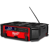 The M18 PACKOUT Radio + Charger is the ultimate jobsite sound system, and is fully compatible with all PACKOUT Modular Storage System solutions. This 10 speaker sound system delivers the user and the jobsite with 360 degree sound. The Milwaukee M18 PACKOUT Radio + Charger delivers full range connectivity with Bluetooth 4.2, an auxiliary input, and an AM/FM radio. The Bluetooth speaker also features a built-in M18 charger. This heavy duty jobsite radio has a 2.1A USB output to keep M18 REDLITHIUM-ION batteries, and mobile devices charged all day long.