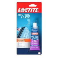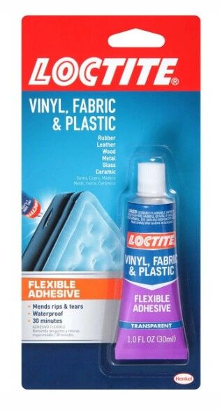 Loctite Vinyl, Fabric & Plastic Flexible Adhesive is a clear liquid adhesive formulated for quickly and easily repairing and mending flexible plastics such as vinyl seats, cushions, tarps and outdoor gear. This unique adhesive dries transparent for invisible repairs and squeezes out effortlessly. Easy to use, this adhesive sets in just 10 minutes and cures fully in 1 day and stays flexible for long-lasting repairs on vinyl, fabric, and plastic inside or out.