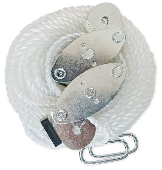 Block and tackle mechanism made of smooth operating nylon rollers and rust proof cadmium plated housing, minimizes the work involved in lifting heavy products for cleaning, etc. Also great for fishing, camping, and boating.