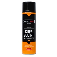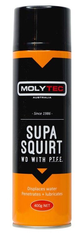 The Molytec Supa Squirt Water Dispersing Fluid with PTFE Aerosol by Molytec is a Multipurpose PTFE aerosol that disperses water lubricates and penetrates and contains P.T.F.E while protecting machinery toys guns and fishing tackle. It offers 400g and is suitable for machinery protection.