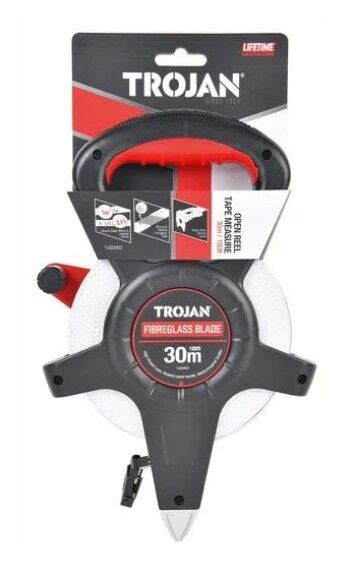 Trojan's 30 metre open reel tape measure enables convenient measurement of extended lengths and negotiates curves and corners with ease. Its compact design makes it portable in a toolkit, making it an ideal tool for DIY, carpentry, and construction applications.
