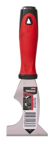 Features: Durable Stainless steel head Soft rubber grip handle for added comfort End metal cap for easy removal of tough residue Lifetime Warranty The Trojan 6-in-1 multifunction paint scraper is ideal to remove old paint, loose material or varnish offsurfaces such as wood, walls and metal. The Trojan scraper can be used for cleaning out and widening cracks. The sides of the tool are ideal for opening paint tins, and the curved surface can be used to remove excess paint out of rollers.