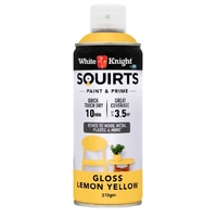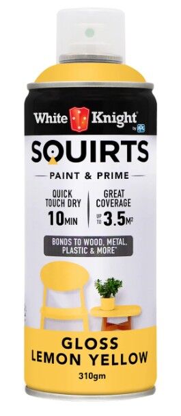 White Knight Squirts Paint and Prime Lemon Yellow Gloss Spray Paint is a paint and primer in one, designed to make DIY projects quick and easy.
