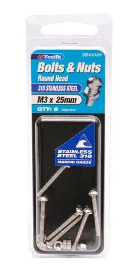 Zenith M3 x 25mm 316 Stainless Steel Round Head Bolt And Nut - 6 Pack - 2310753